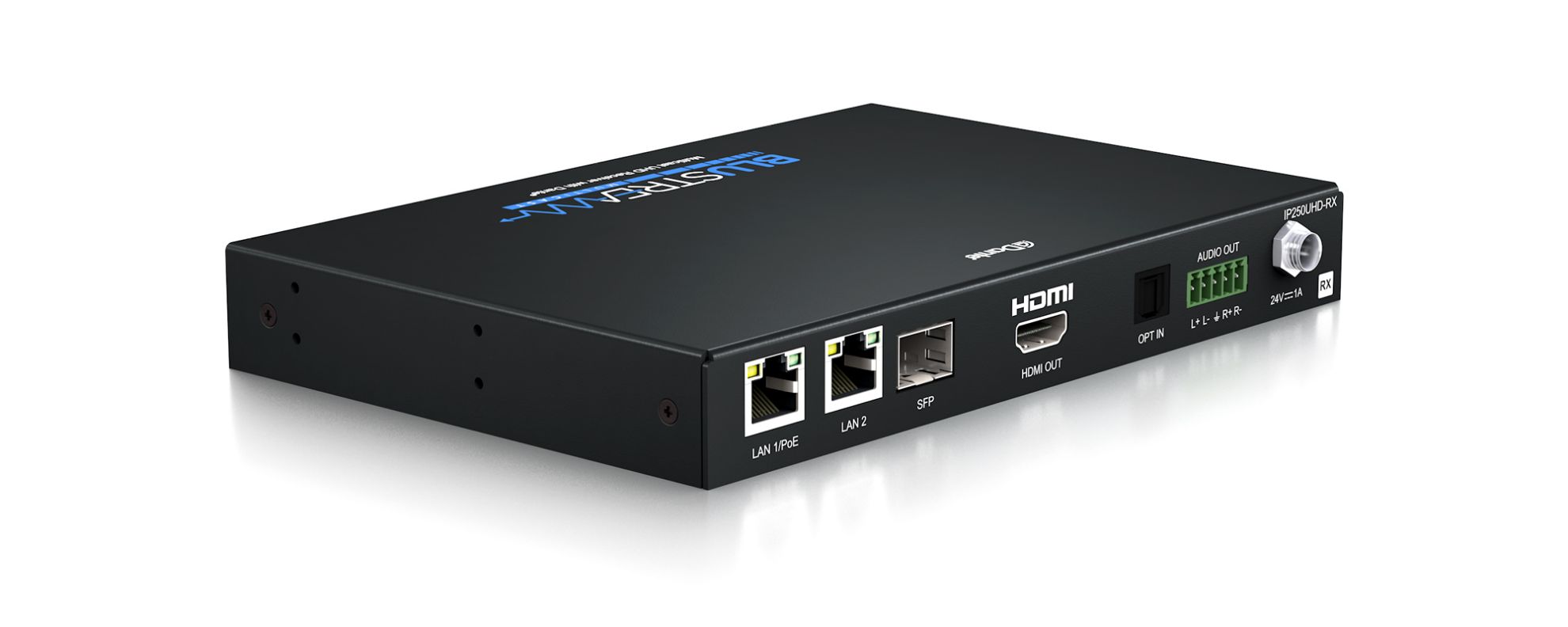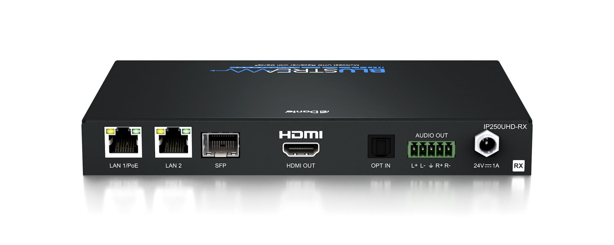 The IP250UHD-RX features dual RJ45 network ports for independent or combined HDMI and/or Dante signal distribution.