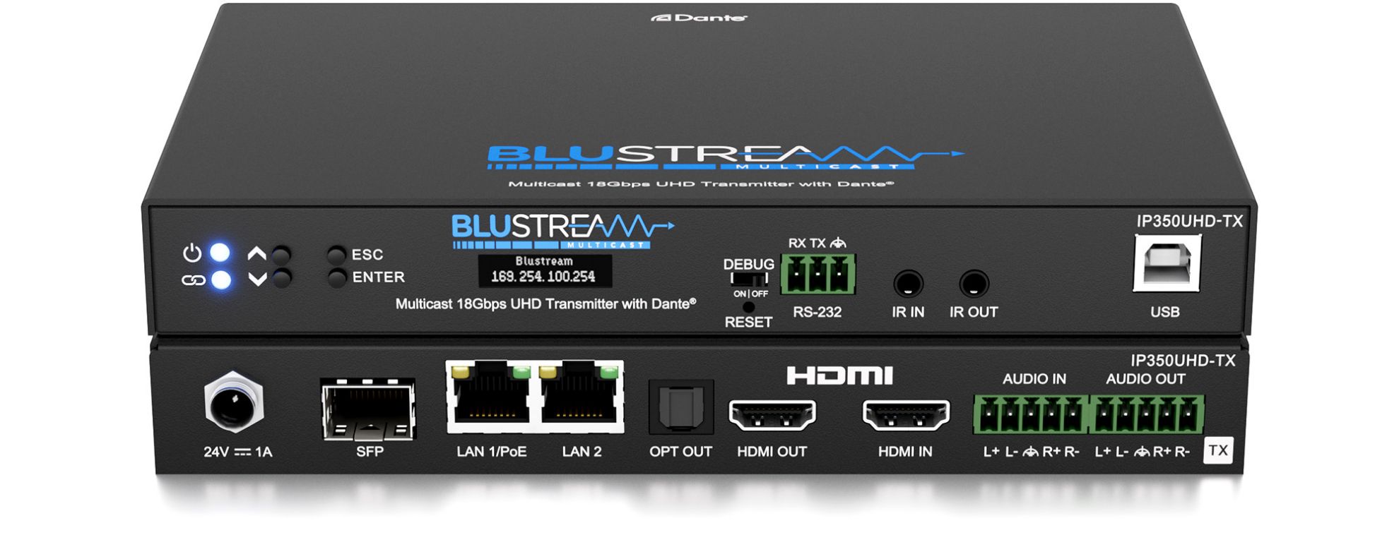 The IP350UHD-TX can support both video and Dante audio distribution from a single network. A second RJ45 connection allows for the Dante audio network interface to be segregated from the video over IP network for larger systems, or where the networks need to be managed independently.