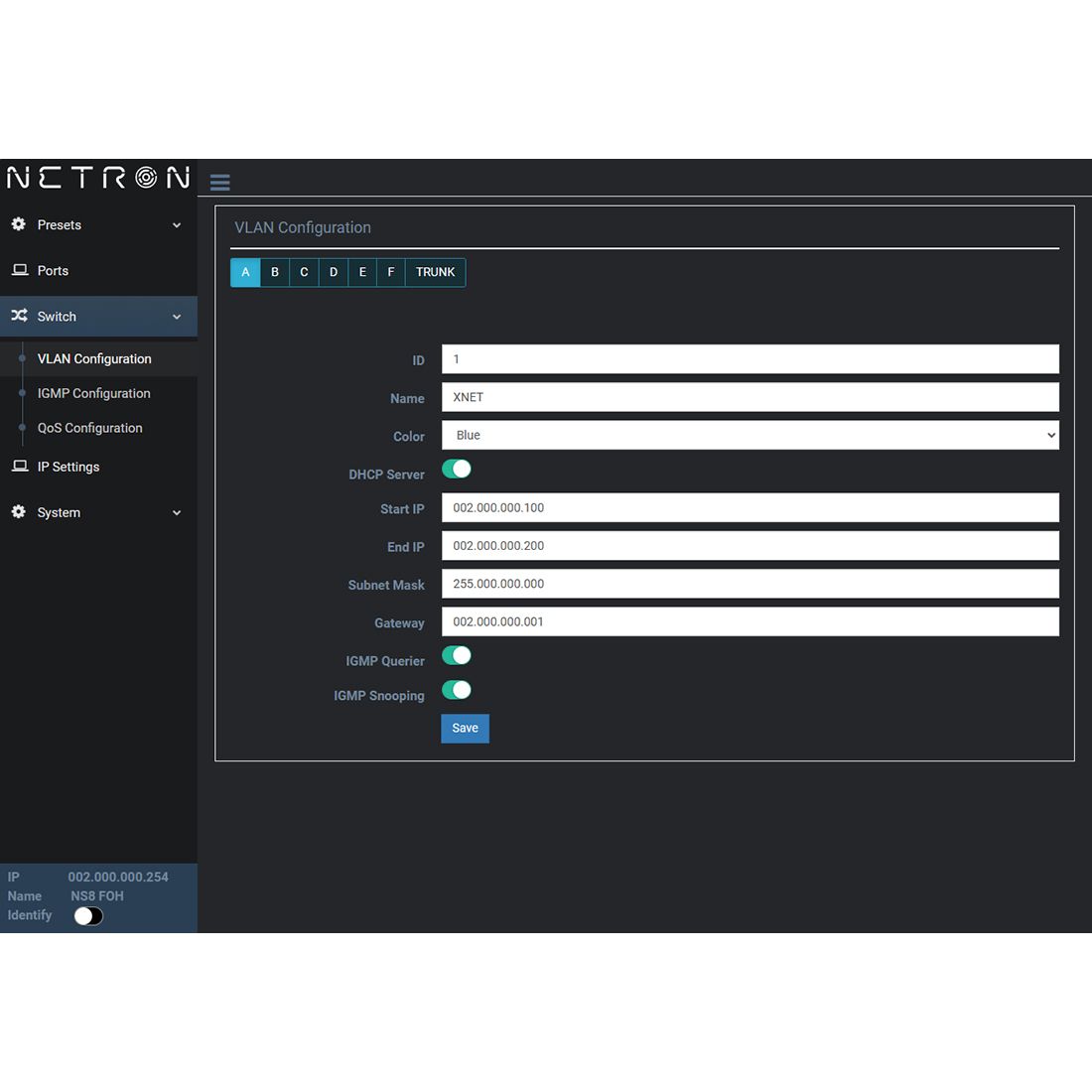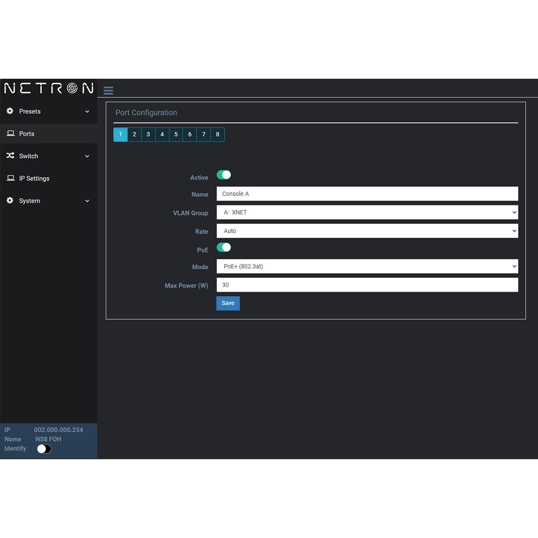 The NETRON NS8 IP is an IP66 rated rugged outdoor network switch featuring 8 Gigabit ports and PoE+ support.With a total power budget of 100W the NS8 IP is ideally suited to distribute data and power to NETRON nodes or any other PoE compatible network appliance.