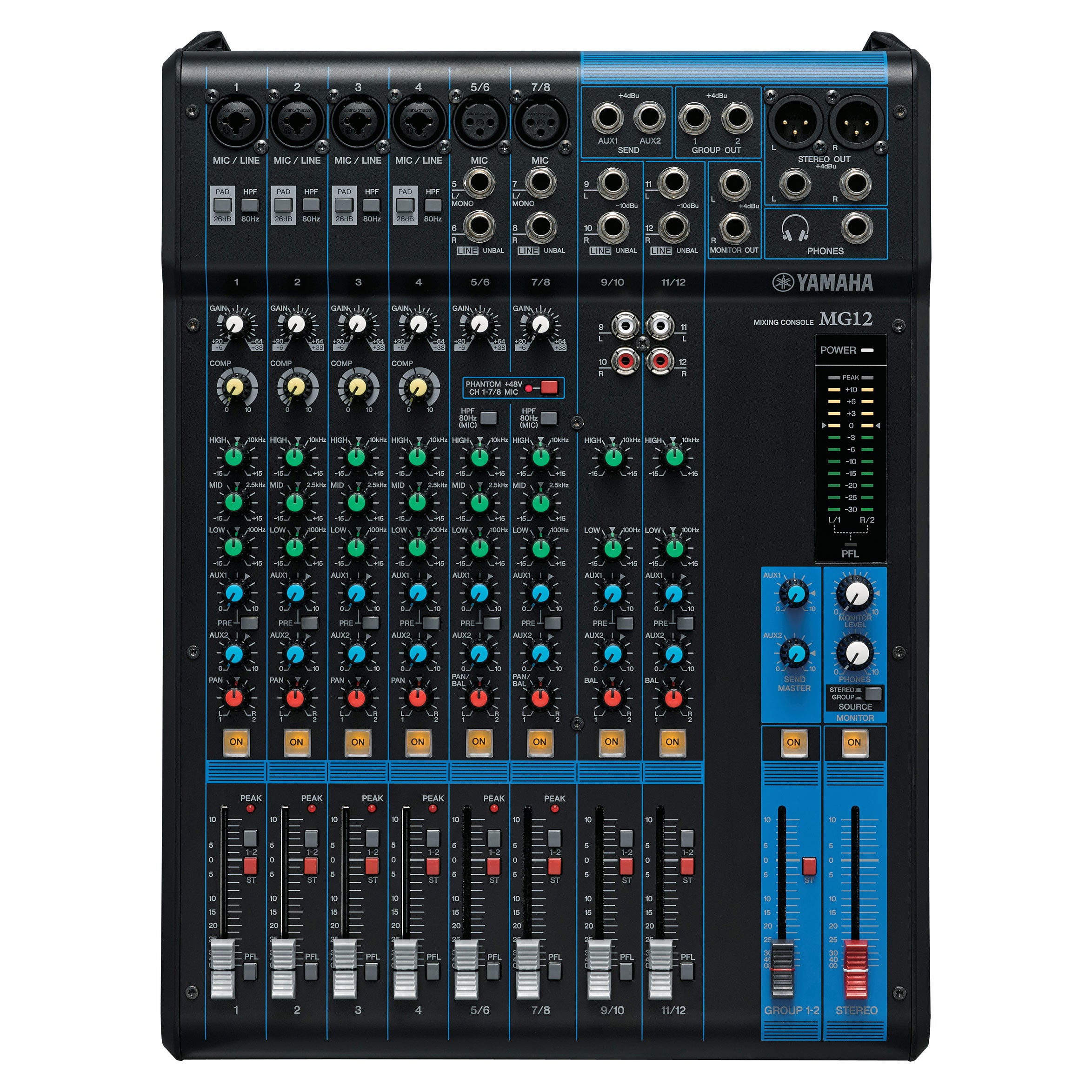 12-Channel Mixing Console: Max. 6 Mic / 12 Line Inputs (4 mono + 4 stereo) / 2 GROUP Buses + 1 Stereo Bus / 2 AUX