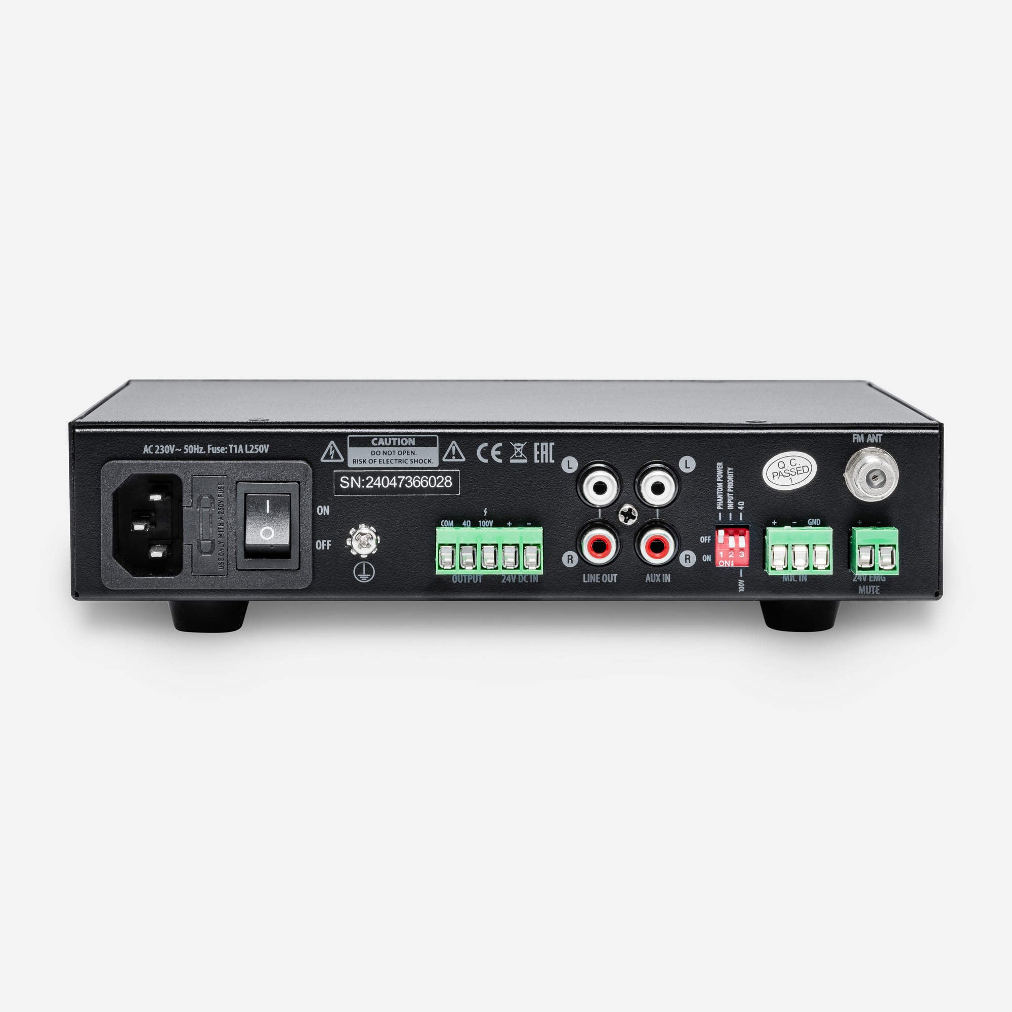 Outputs: Low impedance output - 4 Ω; Hi impedance output - 100 V, 1x Stereo RCA line out