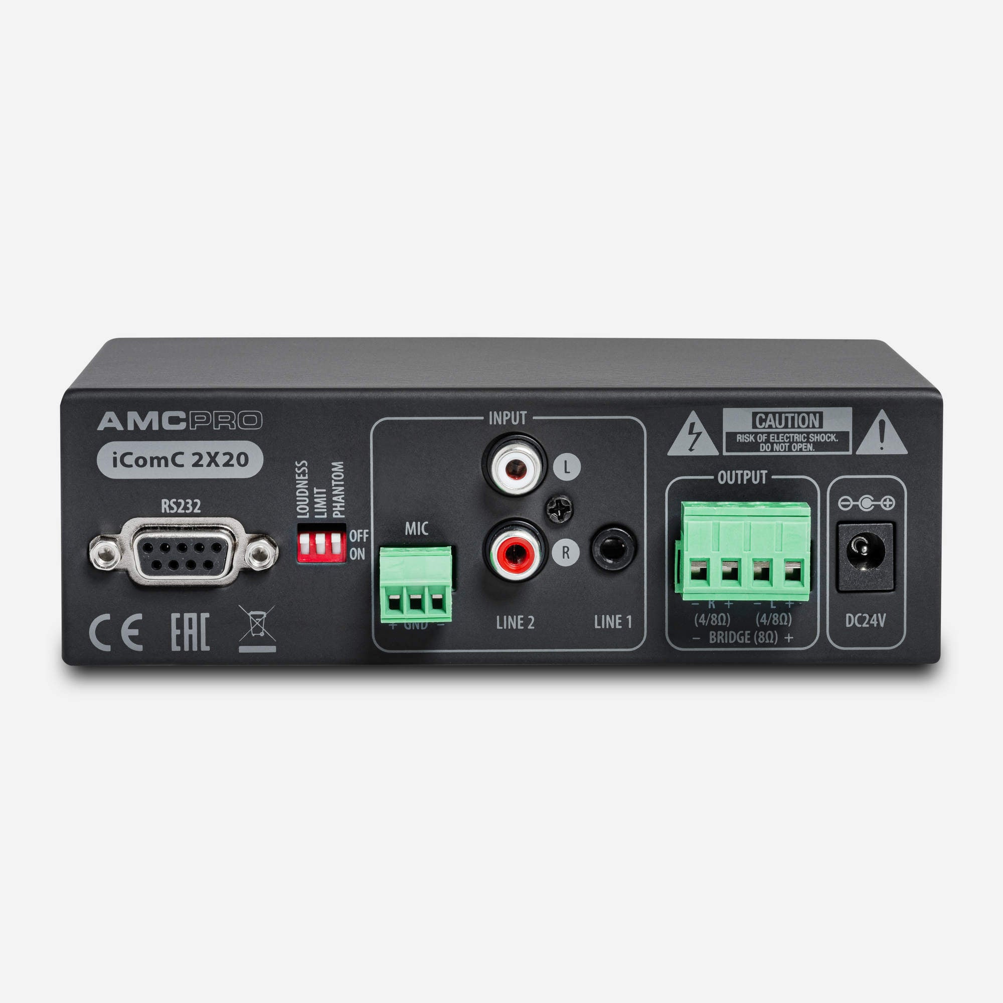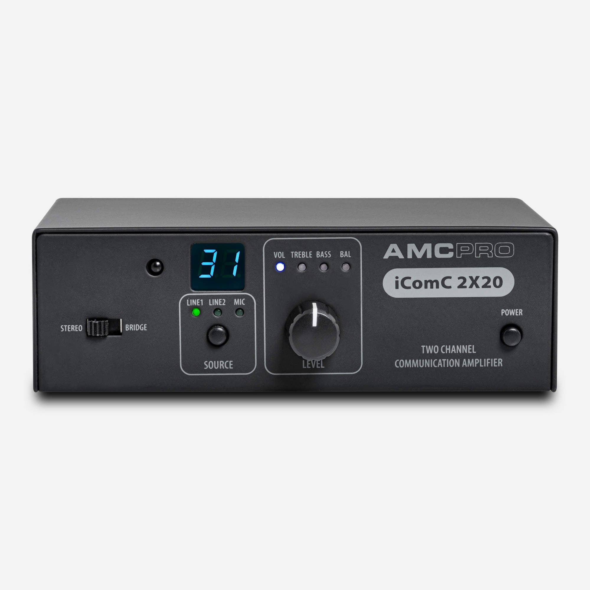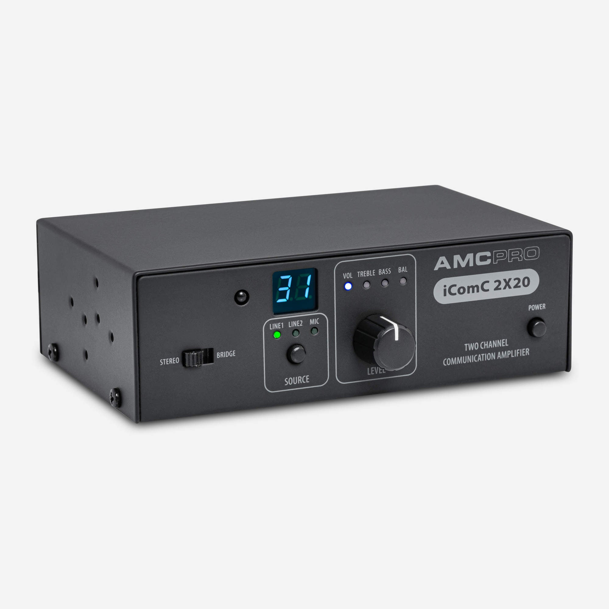iCOMC 2X20 is a two-channel audio communication amplifier with RS232 interface and IR remote control.