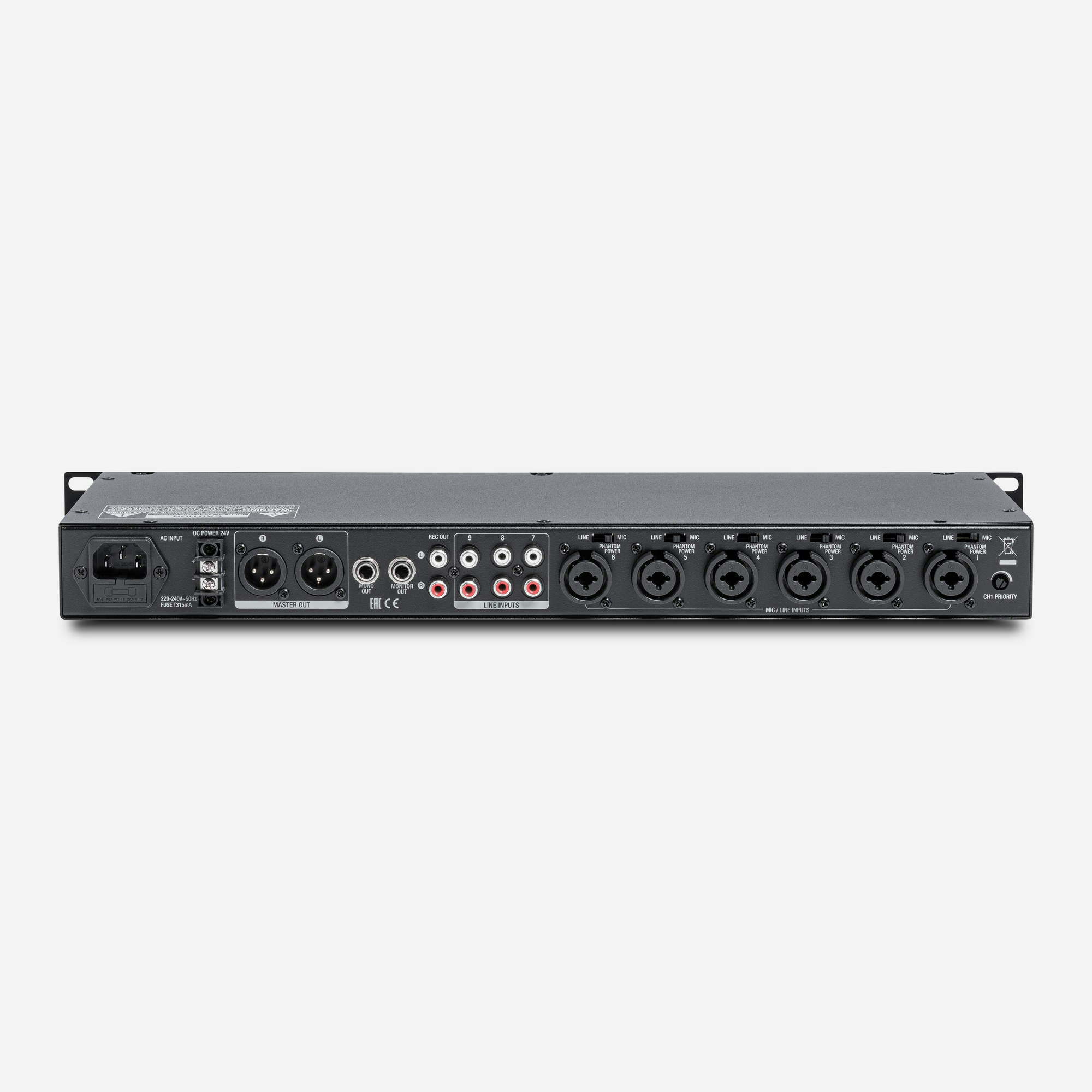 It has 6 balanced COMBO XLR inputs with selectable MIC/LINE gain, and three stereo RCA inputs. Phantom power is activated via DIP switch on each universal COMBO XLR input. Priority is assigned to the first universal input. The unit includes low, mid, and high tone controls, as well as mono, monitor, and master output level controls. Signal presence LEDs indicates input status; output signal level is metered as well. Outputs: balanced stereo XLR, balanced 6.3 mm TRS jack mono and monitor, stereo RCA output for recording. The device can be powered with external 24V DC power supply.
