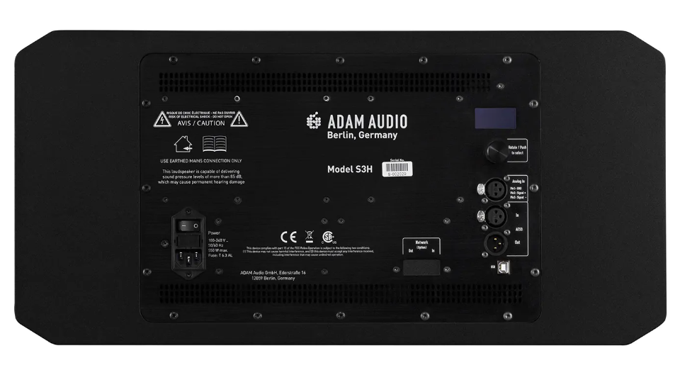 The S Series’ custom-designed DSP optimizes the loudspeaker crossovers to create linear responses for the entire range, as well as providing user equalization and in-room tuning/voicing functions. A unique feature of the S3H’s DSP options is a built-in factory EQ preset that emulates the response of ADAM Audio’s legendary S3A monitor. The DSP also handles the limiter-based high-frequency driver protection, processes the signals from the AES3 digital inputs, and will in time facilitate various expansion options. Software updates can be carried out with ease via the associated USB port, which also allows users to connect computers and control the speakers’ DSP functions via a software front-end.
