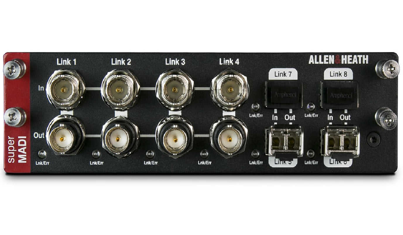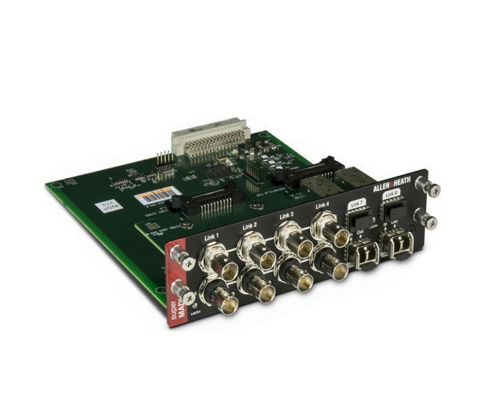 The superMADI audio networking card (M-DL-SMADI-A) is one of a portfolio of audio networking options that can be fitted to any I/O Port in an Allen & Heath dLive S Class or dLive C Class MixRack or Surface. Designed to help integrate dLive into a wide range of broadcast, live interface and recording scenarios, the superMADI interface card has numerous connectivity possibilities, including 8 BNC connectors and 4 SFP slots for fibre optic transceivers. Both coaxial and optical formats offer up to 128 I/O at 96kHz each, and redundancy and sample rate are switchable per link pair, with a choice of Smux or HighSpeed 96kHz mode. The superMADI card can also be used by engineers and rental companies to link to any MADI-enabled third party console, allowing high-channel count digital splits, for example, between FOH and Monitors.