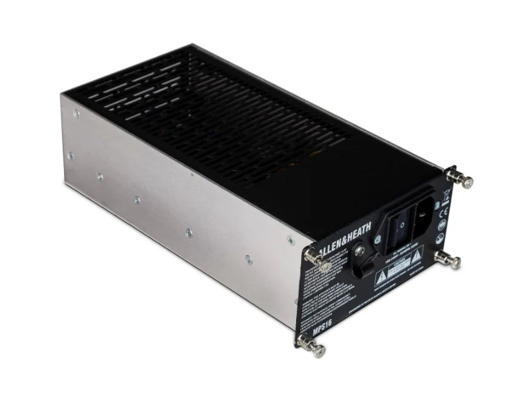 The MPS16 from Allen & Heath is the touring grade power supply for dLive S Class Surfaces and MixRacks, and the DX32 modular expander. Two MPS16 supplies can be fitted to an S Class Surface, MixRack or DX32 expander to provide dual redundancy plus the ability to “hot-swap” supplies during use with no interruption to the audio.