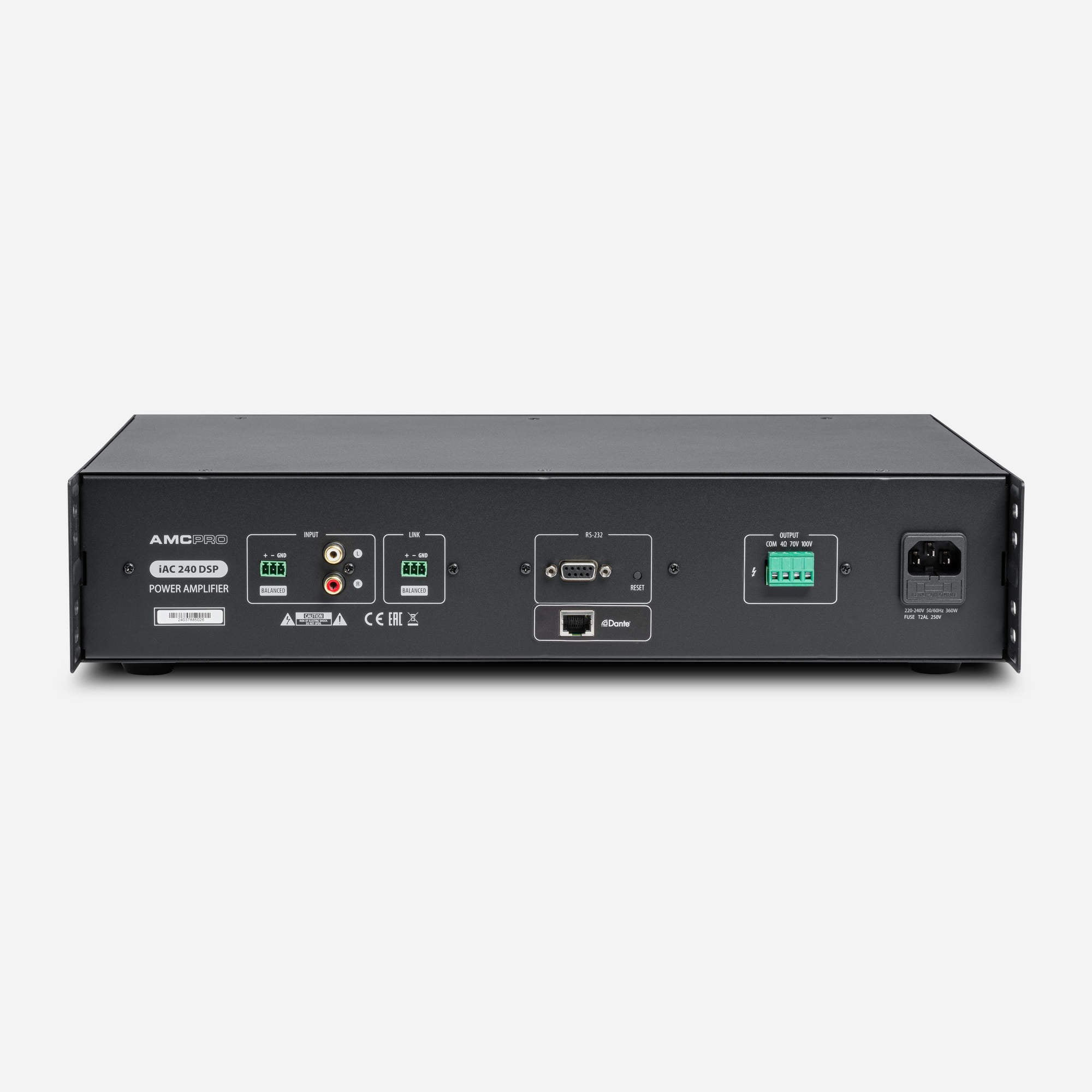 Silent fan mode and DSP processing, including 6-point parametric EQ, limiter, gate, and delay. Contains a Dante digital input card, balanced Phoenix and stereo RCA input connectors, and audio link output connectors. The amplifier has an RS232 control port for integration with third-party control systems, allowing iAC amplifiers to be used in a large and complex audio systems that can be automated and controlled remotely.