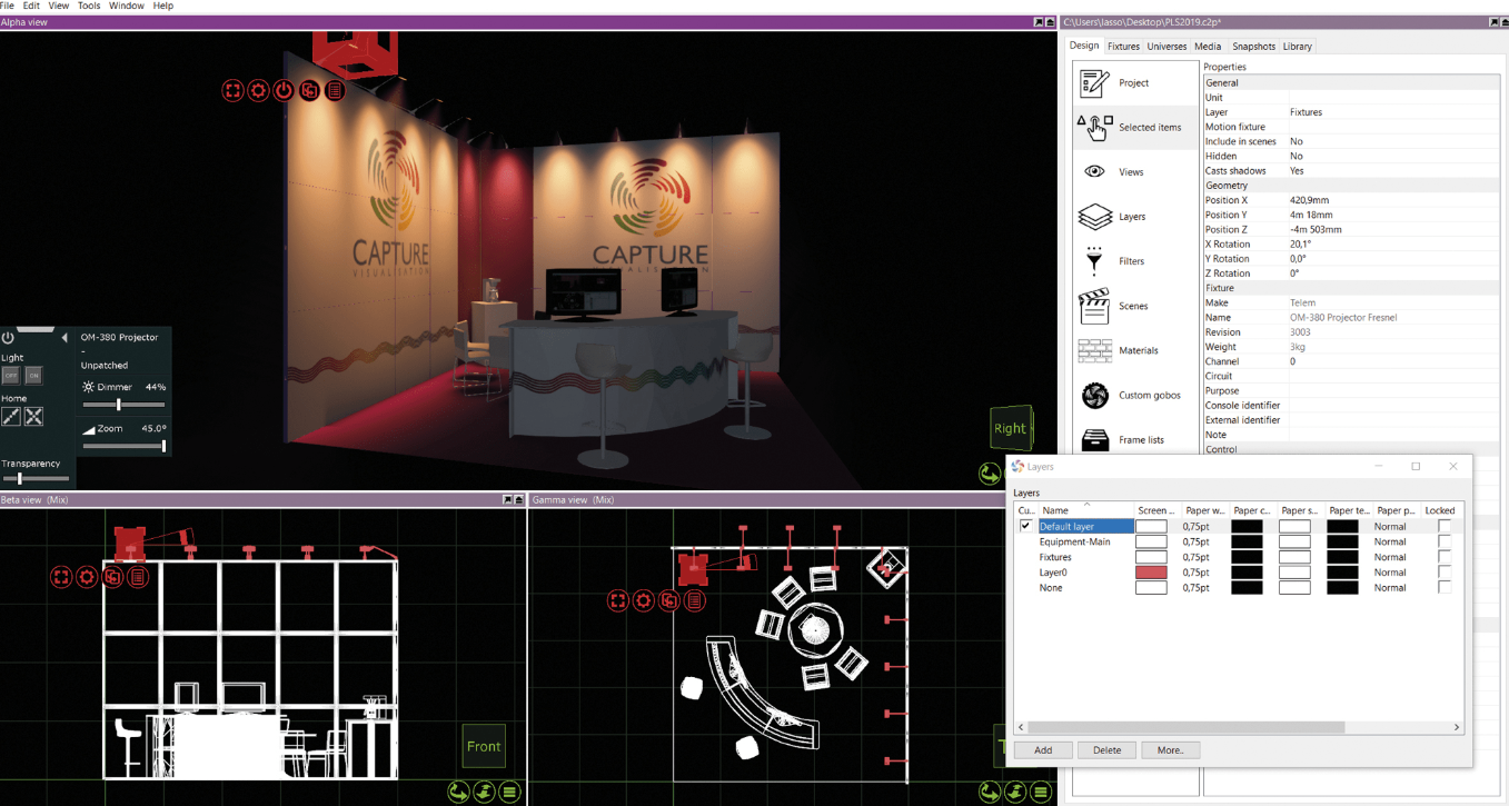 Capture 2025 Solo offers a stable and intuitive working environment, enabling users to design, test, and present lighting concepts before on-site implementation. The new Capture 2025 release delivers improved performance and updated tools while maintaining an accessible license for professional use.