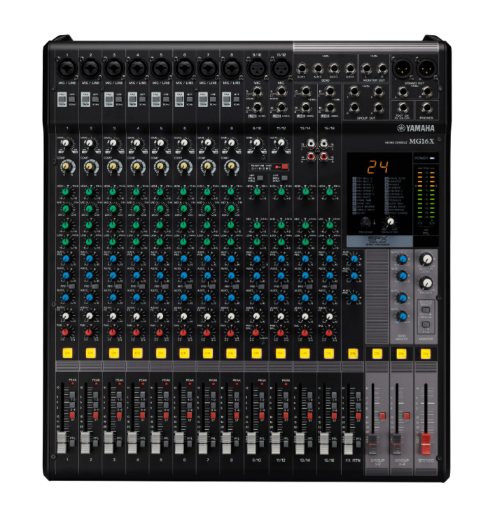 16-Channel Mixing Console: Max. 10 Mic / 16 Line Inputs (8 mono + 4 stereo) / 4 GROUP Buses + 1 Stereo Bus / 4 AUX (incl. FX)