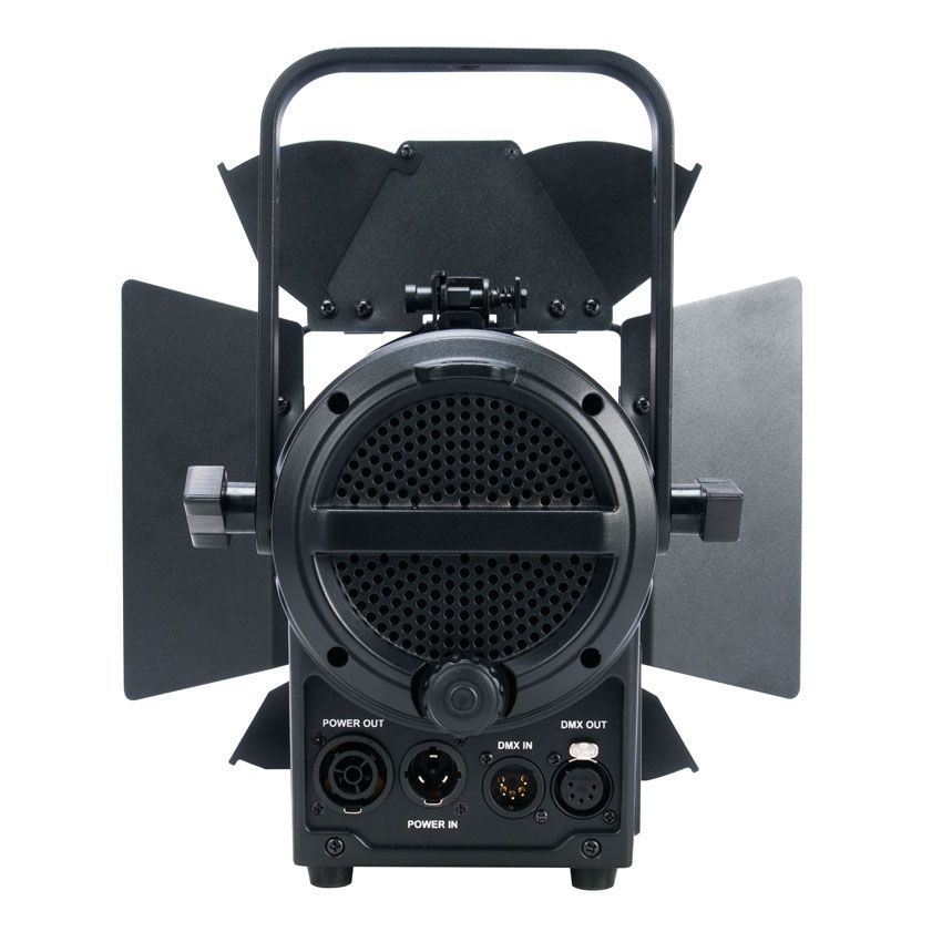 Features include 14° to 33° wide manual zoom, manual and DMX controlled dimmer and shutter, rotary dimmer and zoom dials, smooth 16-bit selectable dimming modes and curves, LED refresh rate frequency adjustment for flicker free operation for TV and FILM, RDM (remote device management) protocol support, 5pin DMX and IP65 Locking Power Cable in/out connections, 4 button control panel, LCD menu display, multiple unit power linking, a universal auto switching power supply (100-240v), gel frame and rotating barn doors (included), and a 3 clamp position adjustable mounting yoke.